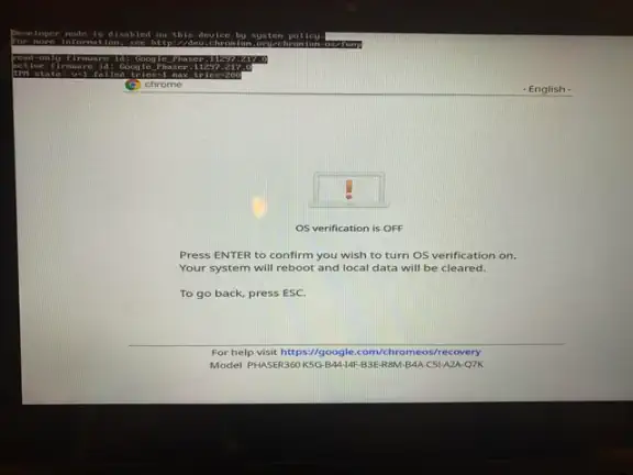 It will now say something about "Confirm returning to secure mode" or that "OS verification is OFF". You will not actually be in dev mode, but the exploit will work regardless. Your screen should look like one of the images below: