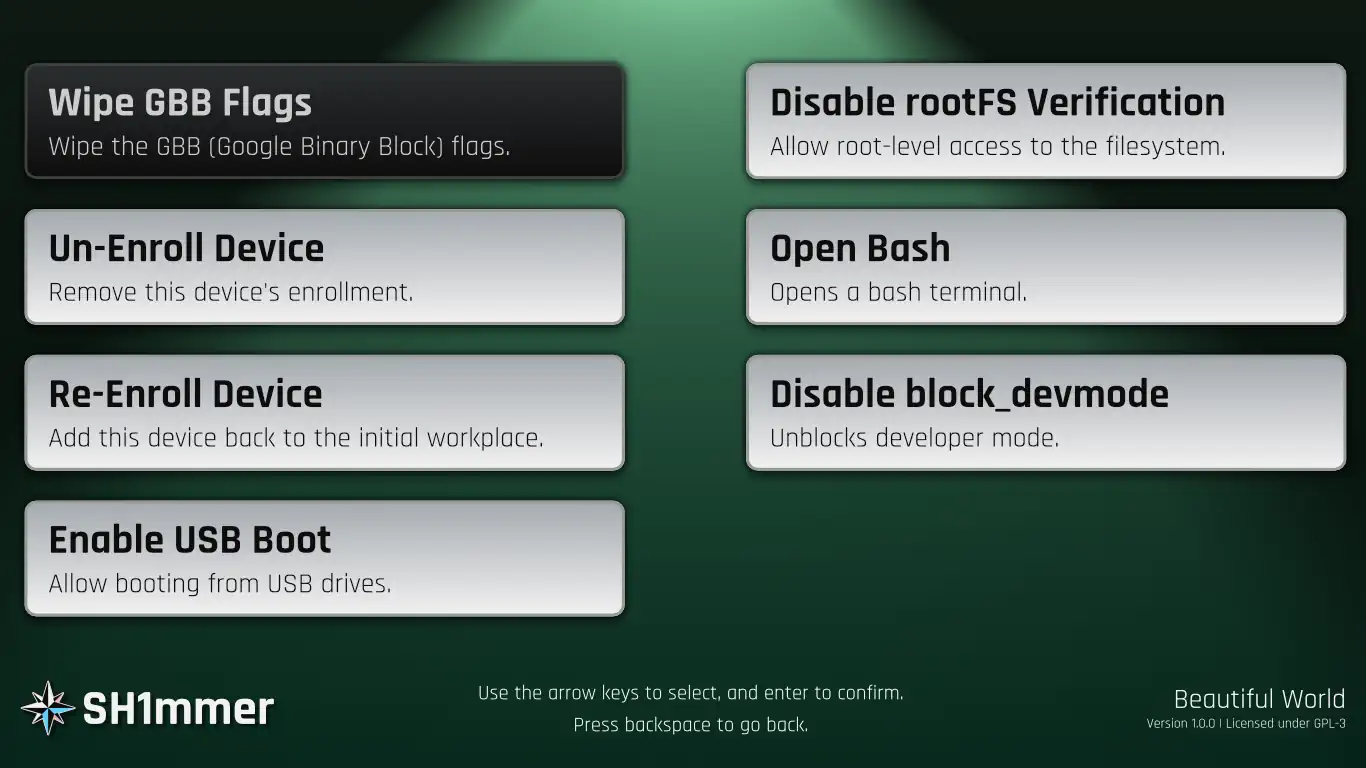SH1mmer is an exploit capable of completely unenrolling enterprise-managed Chromebooks. It was found by the Mercury Workshop team and was released on January 13th, 2023. For more info, check out the Writeup by CoolElectronics.